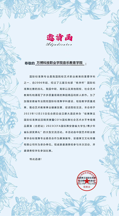 本次大赛由中国艺术职业教育学会标准舞专业委员会作为展演辅导,WATD世界舞蹈教师协会作为赛事指导,CEFA国标舞安徽考区主办。评委团来自北京、上海、广东、湖北、河北、河南、江苏、安徽的22所高校,共48名评委。