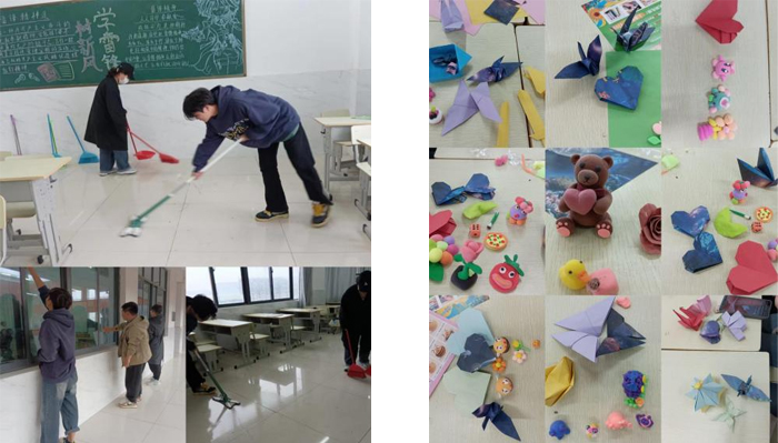 22财管1班的同学在张翠老师组织下,开展了趣味折纸,捏橡皮泥,打扫教室、实验室的劳动实践课程。此次课程不仅培养了学生环保意识,通过实际行动保护环境,还培养了同学们合作意识和沟通能力。