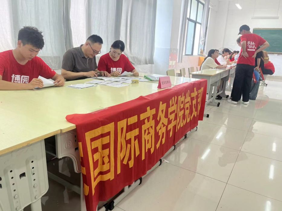 报到大厅内人头攒动。老师和志愿者们紧张而有序地为新生办理入学手续。国际商务学院党支部在新生接待现场设立“党员先锋岗”,党员老师和入党积极分子耐心地解答新生和家长的疑问,细心整理新生的入学材料。
