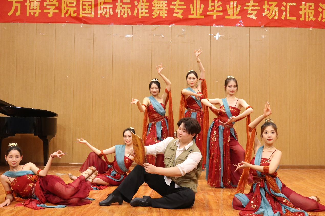 特色节目《大梦敦煌》由国标舞专业王老师与中国舞专业张老师联合指导。该作品创新运用拓扑学原理设计队形变换,7名舞者通过精妙的肢体角度变化,在舞台上构建出动态的莫比乌斯环视觉效果,充分展现了学生三年形体训练与空间感知教学的卓越成果。